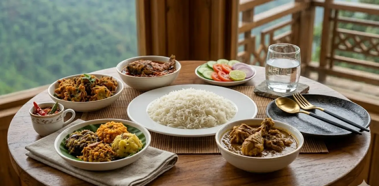 - রাত (সিগনেচার ডিনার): গরম সাদা ভাত, আমাদের স্পেশাল পাহাড়ি ব্যাম্বো চিকেন, আদিবাসী মরিচ ভর্তা, পাহাড়ি মিক্সড সবজি, সালাদ ও ফিল্টার ওয়াটার।