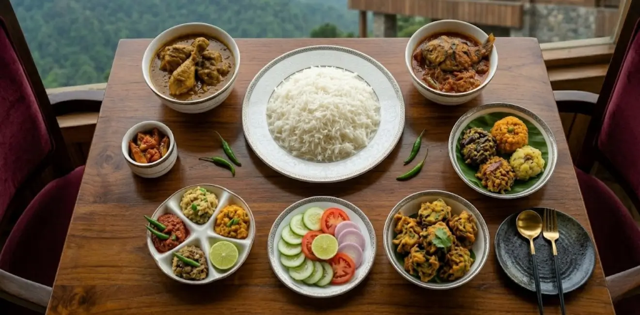 - পাহাড়ি দেশী মুরগী: ঝোল অথবা কষা ভুনা।
